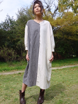 無地とチェックの異なる生地で切替えを