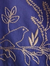 - 線画風に描かれた木々や葉、鳥の刺繍が