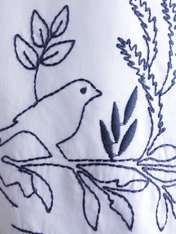 - 線画風に描かれた木々や葉、鳥の刺繍が