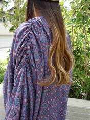 肩のギャザーや前裾にドローストリング紐で